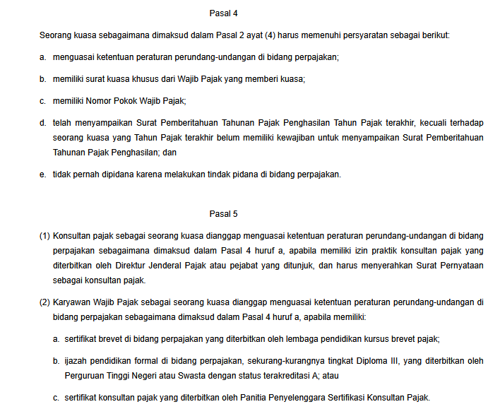 Selain ketentuan mengenai status karyawan tetap yang telah disebutkan, seorang kuasa wajib pajak (karyawan/pegawai) wajib memenuhi persyaratan sebagai kuasa sesuai dengan yang diatur lebih lanjut dalam Pasal 4 dan Pasal 5 PMK 229 Tahun 2014.