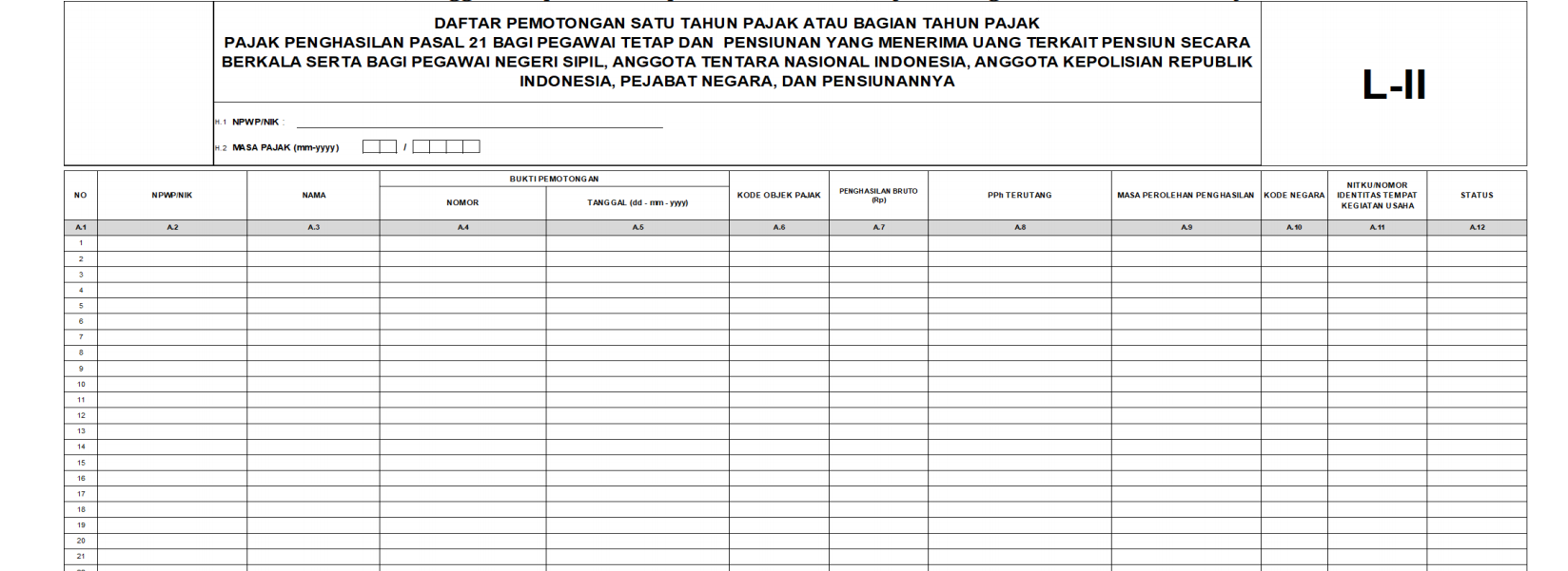 - Tujuan Formulir L-II Formulir L-II digunakan untuk melaporkan pemotongan PPh Pasal 21 untuk satu Tahun Pajak penuh atau Bagian Tahun Pajak. Pelaporan ini khusus ditujukan bagi penerima penghasilan yang telah diterbitkan Formulir BPA1 atau Formulir BPA2. Formulir ini berisi ringkasan data pemotongan PPh Pasal 21 yang terjadi selama periode satu tahun pajak atau bagian tahun pajak tersebut.