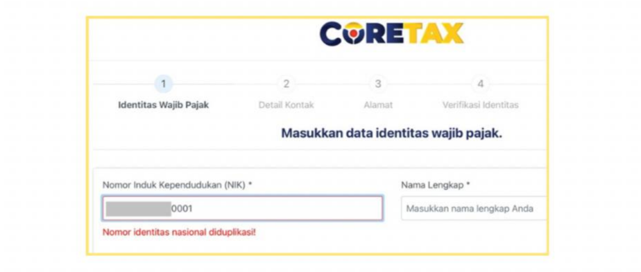 Notifikasi “Nomor Identitas Nasional Diduplikasi!” saat mendaftar di Coretax menandakan salah satu dari dua kondisi: